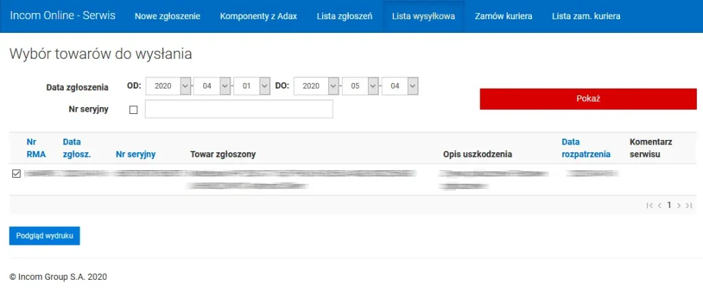 Z kolejnej strony należy wydrukować „Listę Wysyłkową” – system pomaga stworzyć listę wysyłkową, pokazuje pozycje, na które zostały nadane numery RMA.