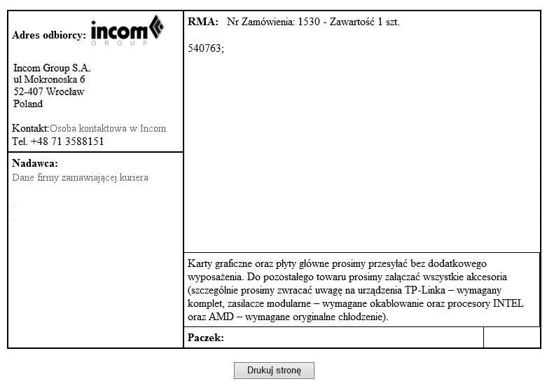 Produkty zgłoszone prosimy pakować zgodnie z normami, jeden egzemplarz „Listy wysyłkowej” włożyć do paczki, a drugi przykleić na paczce. Tylko tak oznaczone przesyłki będą przyjmowane do Incom Group SA.